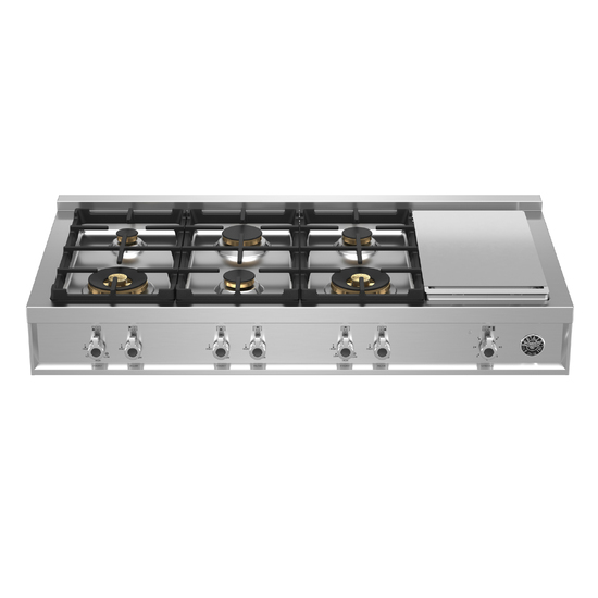 Cook like a pro on the six Monobloc brass burners and spacious cast iron contour grates. Two dual ring power burners provide fastest time to boil in their class. Extra large stainless steel griddle with integrated grease catcher. 100% failsafe thermocouple technology that immediately shuts off the flow of gas in case of a flame outage. Seamless one-piece stainless worktop with integrated spill-control dams makes clen up easy.