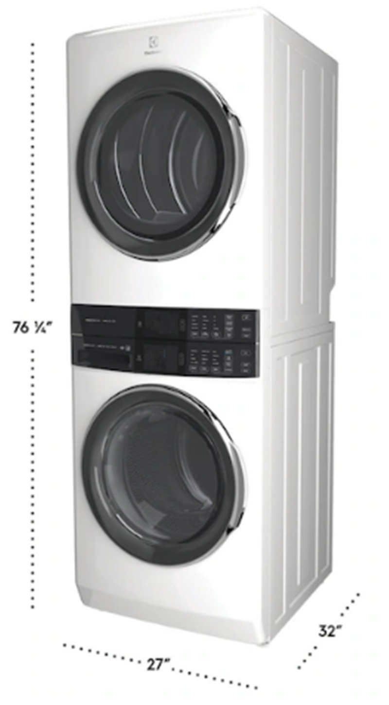 • Fully integrated vertical layout takes up half the floor space of a traditional washer/dryer for greater laundry room flexibility, or to fit easily into most closets and other tight spaces. Features a full-sized washer on bottom, a full-sized dryer on the top, and a control panel in the middle for easy access.