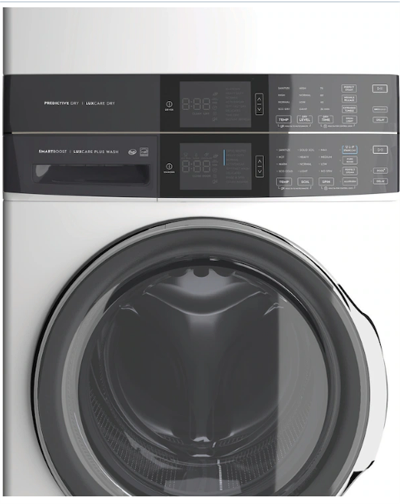 27 Inch Gas Stacked Laundry Tower with 4.5 cu. ft. Washer and 8 cu. ft. Gas Dryer, Smartboost Technology, LuxCare Plus Wash and Dry System, Optic Whitesâ„¢, Pure Rinse, Perfect Steamâ„¢ and Reversible Doors (Two Outlets Required): White