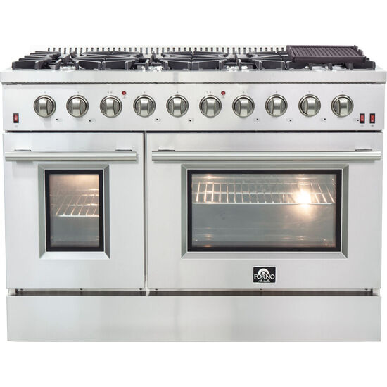 The 48 Inch Forno Galiano Gas Range brings professional styling and performance into your home kitchen with its durable stainless-steel design. The cooking surface has 8 sealed burners with a total output of 107,000 BTU, which one is a 20,000 BTU dual-ring burner that can simmer at 1,000 BTU. Continuous cast iron grates ensure stability on the enamel surface. The main oven of 4.32 Cu.Ft has a convection fan with 30,000 BTU Total Broil and Bake output. The secondary oven has a capacity of 2.26 Cu.Ft. with a 14,000 BTU Bake output. Both ovens have an impressive enamel interiors allowing for easy cleaning and 3-layer glass oven door window provides both heat retention and an unobstructed view. It features 2 racks per oven, reversible griddle, an LP conversion kit, and durable zinc-coated metal knobs. Elevate your kitchen with performance, convenience, and enduring elegance.