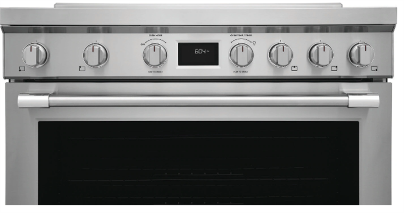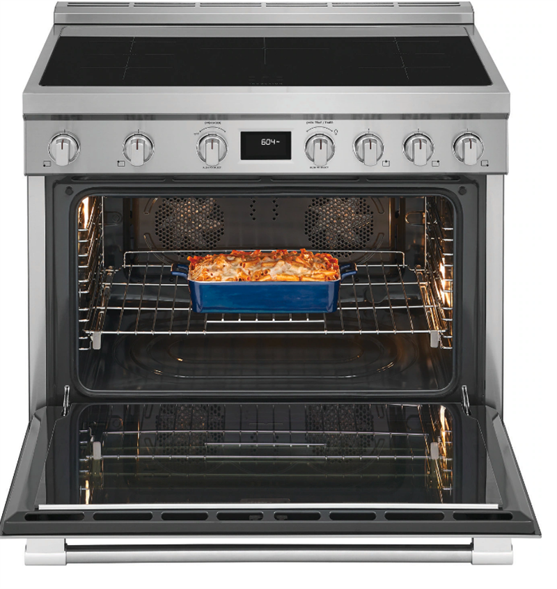 The Frigidaire Professional 36 Induction Range features dual fan convection that effectively circulates hot air throughout the oven cavity, giving you perfectly baked muffins, proteins and more. Plus no cooktop is easier to clean than induction, since induction heats the pan and not the cooktop around it, spills wipe up more easily. This range also features backlit LED knobs and our Smudge-Proof(R) Stainless Steel finish that resists finger prints, making cleanup easy.