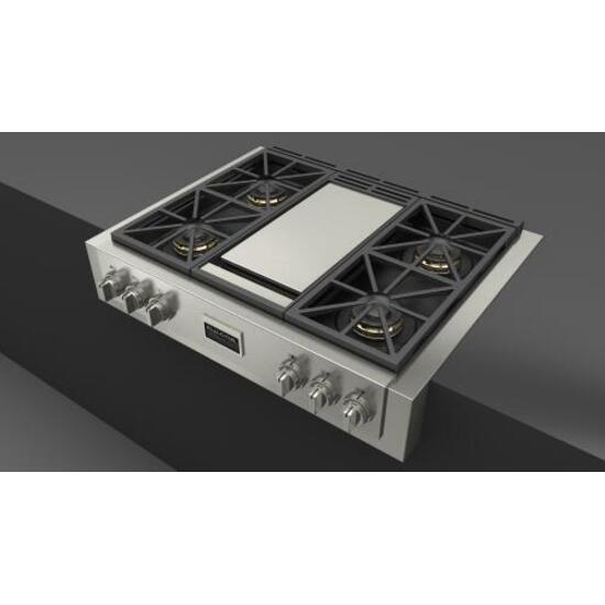 The all-new 36� Range Top with griddle carries the same powerful yet elegant design as all Sofia ranges but now has a thoughtfully designed surface cooking with 4 burners and a central griddle. Each burner features our 5-in-1 Crescendo burner beneath our continuous heavy-duty cast-iron grates with the same Trilaminate Stainless Steel griddle as our 48� ranges, providing unparalleled flexibility in a 36� range. The Crescendo burner 20,000 BTU has the power to sear, saut�, and boil but also the control to temper and simmer the most delicate dishes.