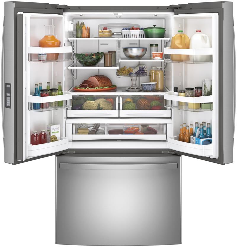 28.7 Cu. Ft. capacity provides spacious storage for both fresh and frozen foodsFrench-door design allows easy access to both the refrigerator and freezer compartmentsFingerprint-resistant finish helps maintain a clean, smudge-free exteriorAdjustable shelves and drawers for flexible and customizable storage optionsBottom freezer with organized compartments for easy access to frozen itemsEnergy-efficient cooling technology helps maintain freshness while minimizing energy consumptionSleek, modern design complements a variety of kitchen stylesIdeal for large households or those in need of spacious, efficient storage