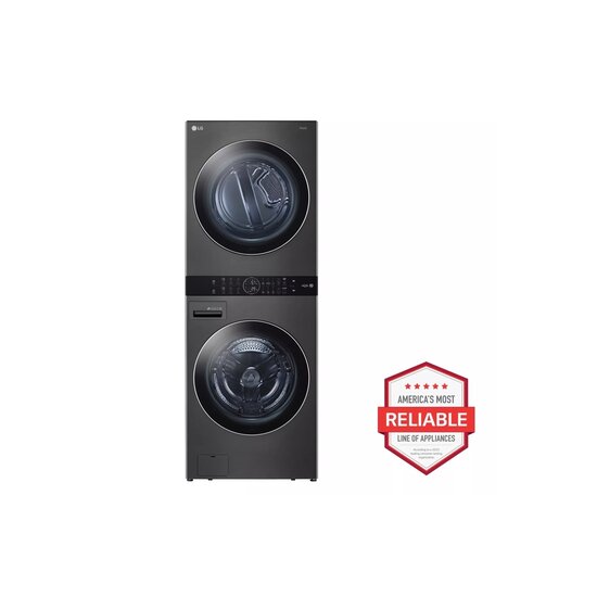 The Single Unit Front Load LG WashTower with Center Control features a 4.5 cu. ft. washer and a 7.4 cu. ft. gas dryer, combining both in a compact, space-saving vertical design.