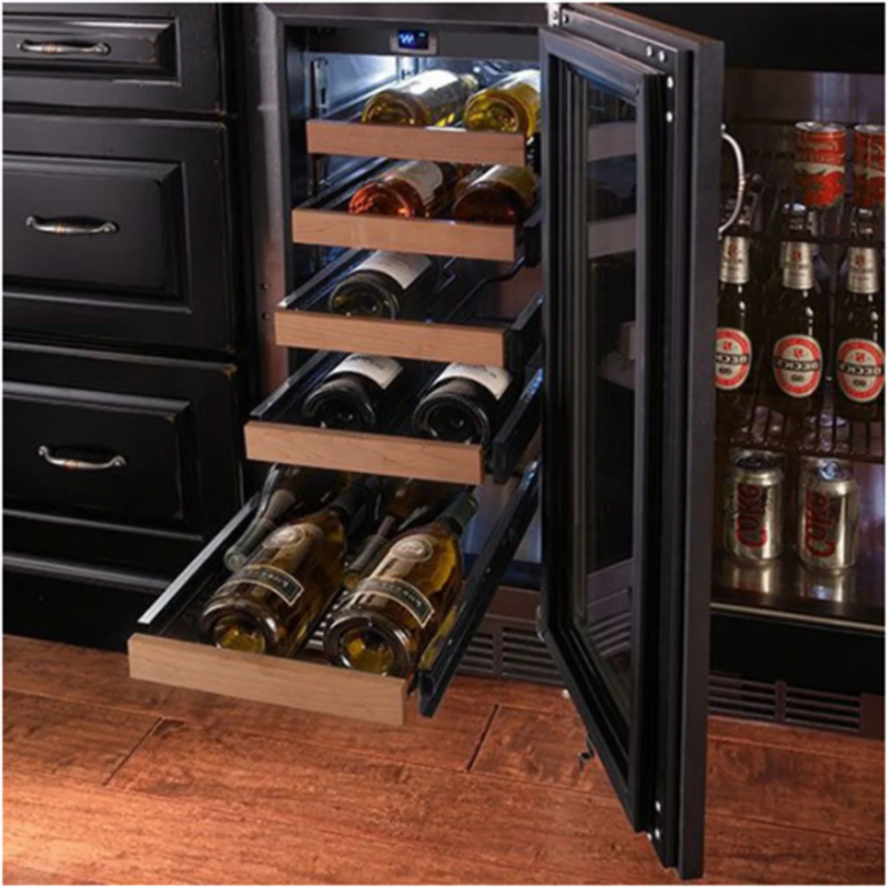- Wine shelves fully extend on vibration dampened, stainless steel ball-bearing glides; stainless steel wine shelves will not absorb odors over time