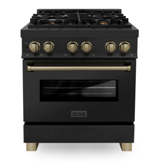 Luxury isnt meant to be desired - its meant to be attainable. The ZLINE Autograph Edition 30 in. 4.0 cu. ft. Legacy Dual Fuel Range with 4 Burner Gas Cooktop and Electric Convection Oven in Black Stainless Steel and Champagne Bronze Accents (RABZ-30-CB) pairs a powerful gas cooktop with 4 Italian-crafted burners, an electric convection oven with a Landscape oven door window design, and elegant champagne bronze knobs and handle. With innovative features designed to enhance your kitchens capability, ZLINE Legacy Dual Fuel Ranges provide a professional culinary experience by pairing unmatched performance with timeless style.