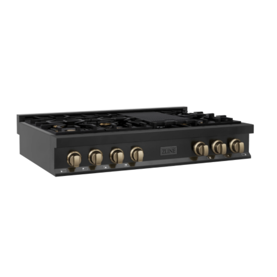 ZLINE Autograph Edition 48'' Porcelain Rangetop with 7 Gas Burners in Black Stainless Steel and Champagne Bronze Accents (RTBZ-48-CB)
