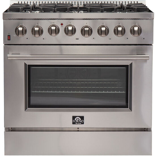 The 36 Inch Galiano Dual Fuel Range combines professional style and performance in a durable stainless-steel design. With 6 sealed burners delivering a total output of 83,000 BTU, including a potent 20K dual-ring burner for boiling or searing, it excels in simmering delicate items like chocolate or sauces. The continuous cast iron grates ensure stability and easy pan sliding. The 5.26 cu.ft. electric oven outputs 6,300 Watts, perfect for baking, roasting, and broiling. Choose from true convection bake, broil, or roast. It includes 2 oven racks, an LP conversion kit, and elegant zinc-coated metal knobs with bezel rings that retain their beauty over time.