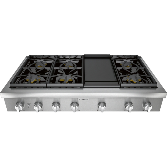 48-Inch Gas Rangetop: Features a spacious cooking surface with 6 sealed burners for all your cooking needs.Pedestal Star® Burners: Offers even heat distribution for optimal cooking performance and consistent results.Continuous Grates: Allows easy movement of cookware across burners for greater flexibility and convenience.2 ExtraLow® Burners: Perfect for gentle simmering and maintaining low temperatures for delicate dishes.QuickClean Base®: A design that makes cleanup easier by minimizing spills and preventing grease buildup.LED Downlighting: Provides clear, bright illumination of the cooking surface for better visibility while cooking.Griddle Included: Offers an additional cooking surface for making pancakes, grilled sandwiches, and more.6 Sealed Burners: Helps contain spills and makes cleaning up simple by preventing food from falling into hard-to-reach areas.