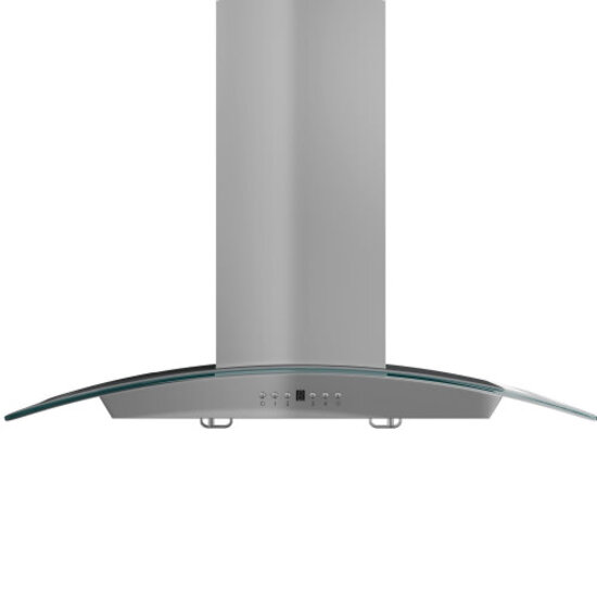 The Island Mount Range Hood with a 4-speed 400 CFM motor offers adjustable ventilation to suit your cooking needs, efficiently clearing smoke, odors, and moisture. Featuring a user-friendly push-button control panel, it allows easy management of fan speed and lighting.