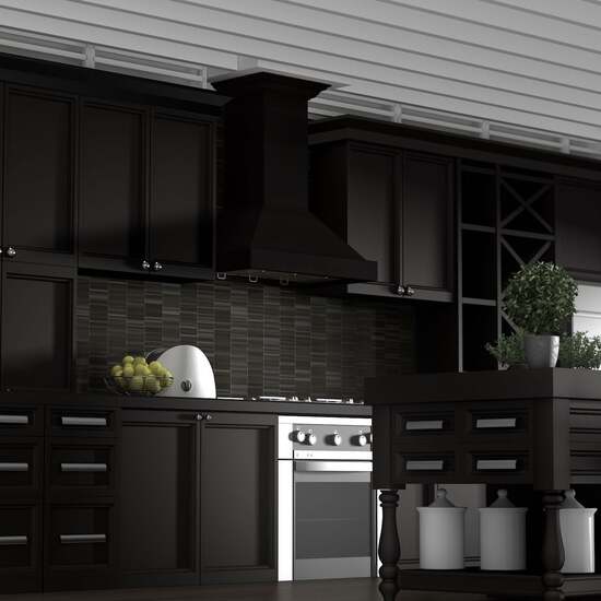 The Wooden Wall Mount Range Hood features elegant crown molding and a powerful 4-speed 400 CFM blower, providing efficient ventilation for your kitchen.