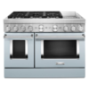 The 48-inch freestanding induction range in Stone Blue combines elegance and high performance. It features five induction elements that provide precise, energy-efficient cooking. With a total oven capacity of 6 cubic feet and a triple oven configuration, this range offers ample space for large meals and multiple cooking tasks at once.