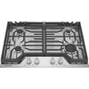 This 30-inch gas cooktop features five sealed burners, providing a versatile cooking surface with a continuous cast iron grate for durability and even heat distribution. The stainless steel surface ensures easy cleaning and a sleek appearance.